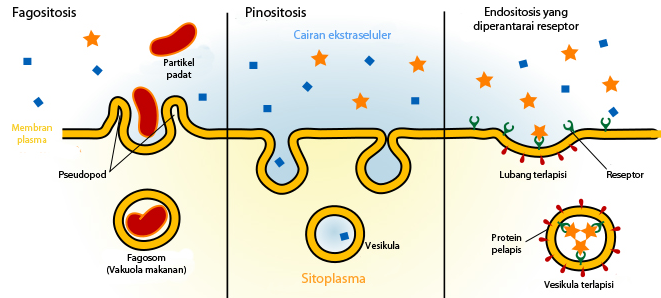 Endositosis dibagi menjadi 3 yaitu fagositosis, pinositosis, dan endositosis termediasi reseptor.